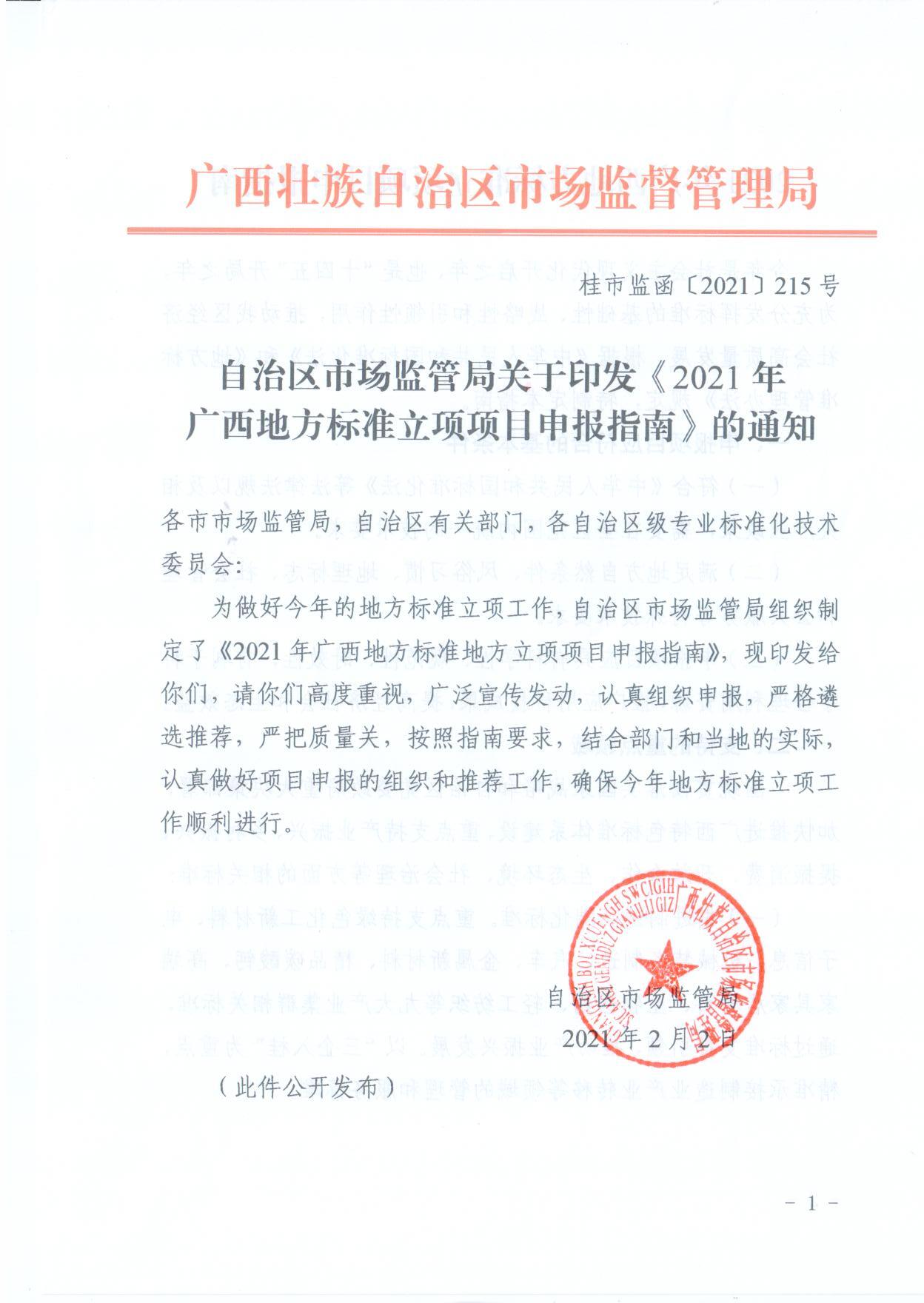 自治區(qū)市場(chǎng)監(jiān)管局關(guān)于印發(fā)《2021年廣西地方標(biāo)準(zhǔn)立項(xiàng)項(xiàng)目申報(bào)指南》的通知